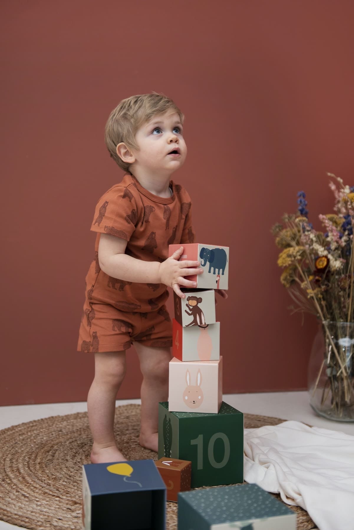 Fun is guaranteed with stacking blocks! Each side of the cube has a different theme to discover. The child learns while playing. This set includes 10 colored cubes. The child can stack them, do a puzzle with animals, order them by size or learn numbers and objects. There are countless ways to play with these cubes, making them essential among children's toys.