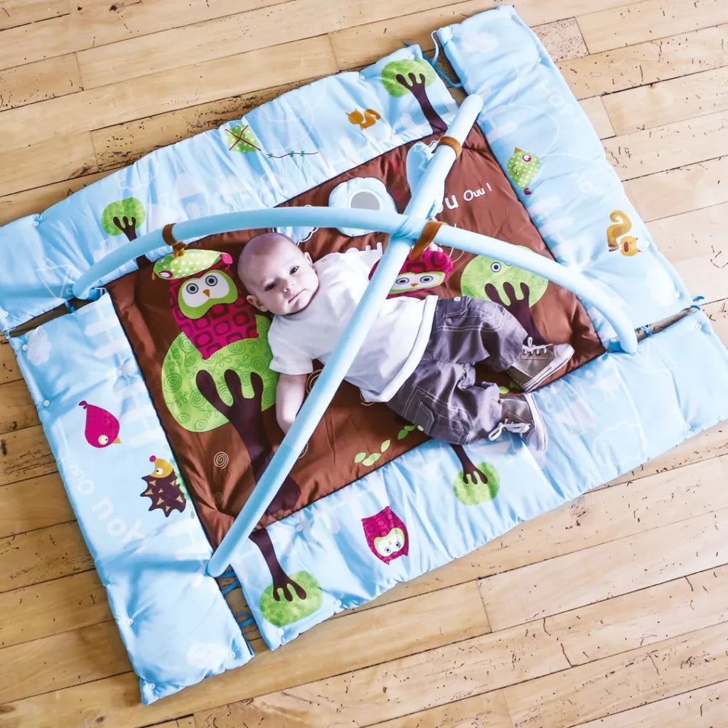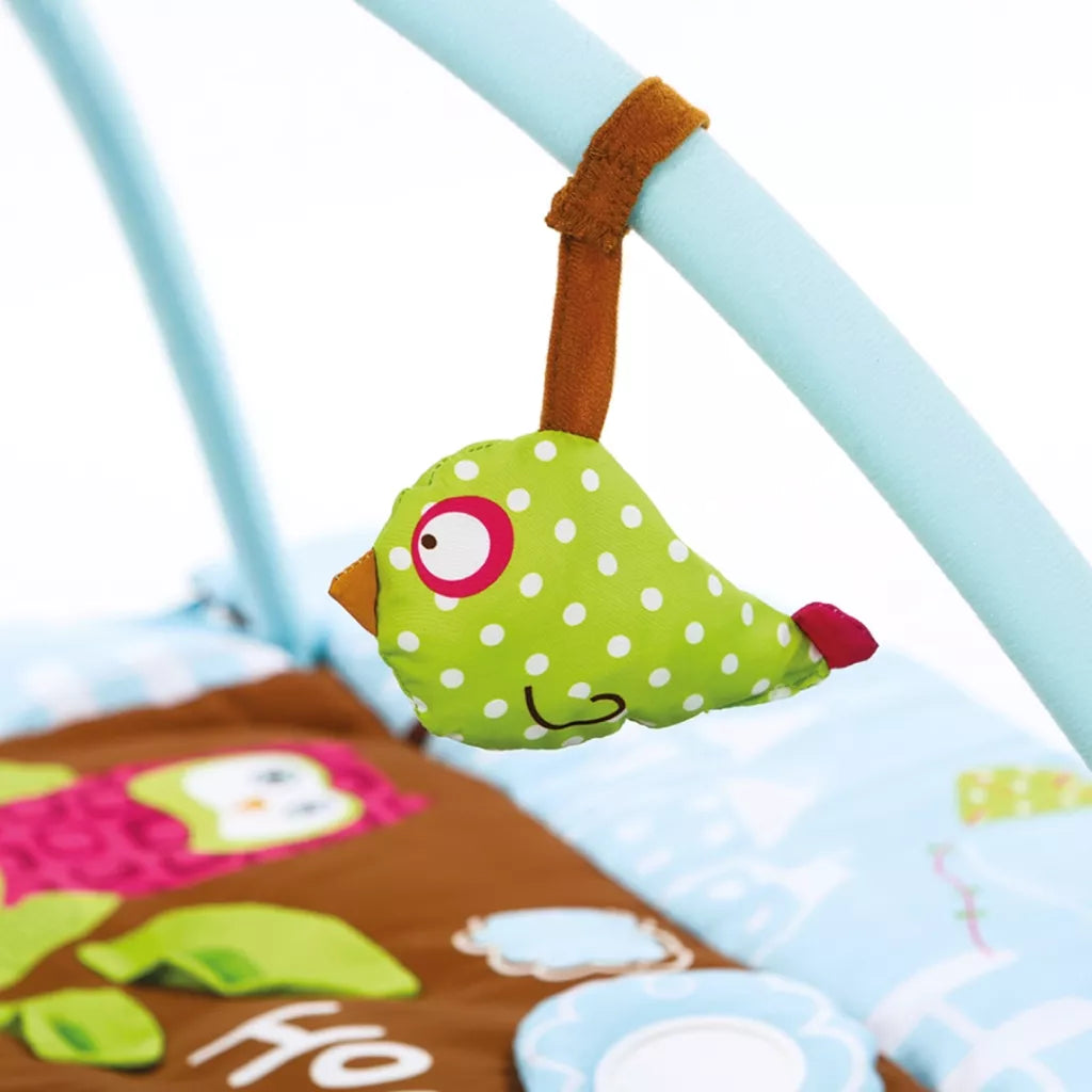 O tapete de atividades "Coruja Azul" permite que o bebé se divirta e descanse sob o olhar atento dos pais. Multicolorido com formas divertidas e texturas diferentes, este espaço dedicado ao estímulo desperta a curiosidade do bebé. Ideal para estimular a motricidade do bebé e desenvolver a sua destreza, também pode estimular a acuidade visual do seu filho graças aos acessórios sensoriais presentes nos arcos: espelho, chocalho, apito, papel barulhento... e os amiguinhos da floresta que enfeitam o tapete. Dobrando as laterais do tapete, forme um pequeno casulo seguro para o seu bebé! O tapete transforma-se facilmente num parque. Os arcos são removíveis.