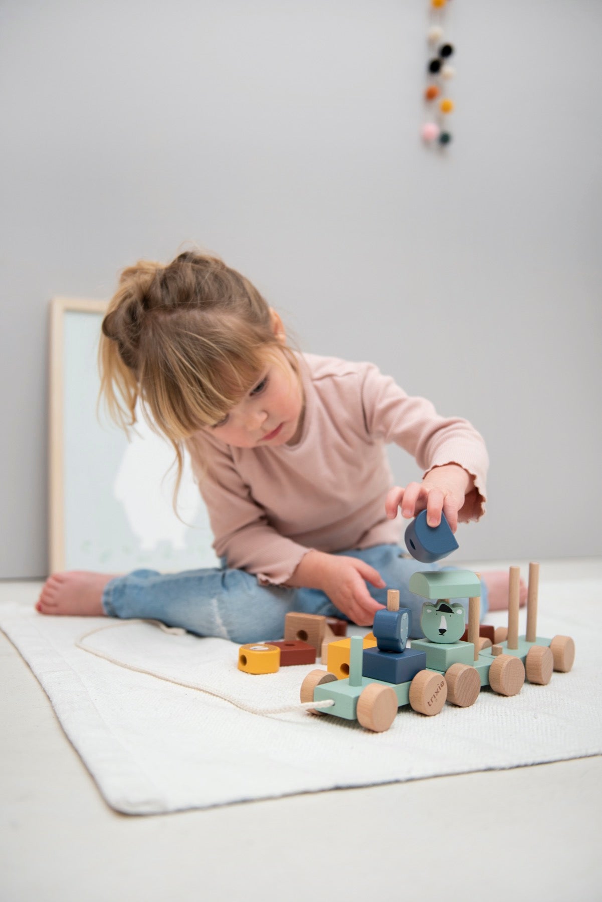¡Súbete al tren con tus amigos animales! Puedes construir tus propios carruajes con los bloques de colores. Usa la cuerda para tirar del tren y vivir divertidas aventuras.