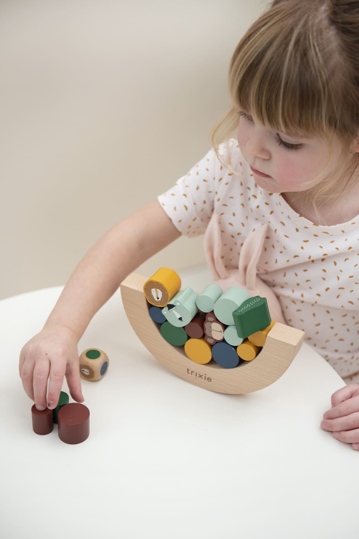 ¡Con estos 20 bloques podrás desafiar tus habilidades! ¡Tira los dados y descubre qué pieza necesitas agregar al juego de swing! Los animales son aún más desafiantes gracias a su forma. ¿Quién será el primero en soltar los bloques?