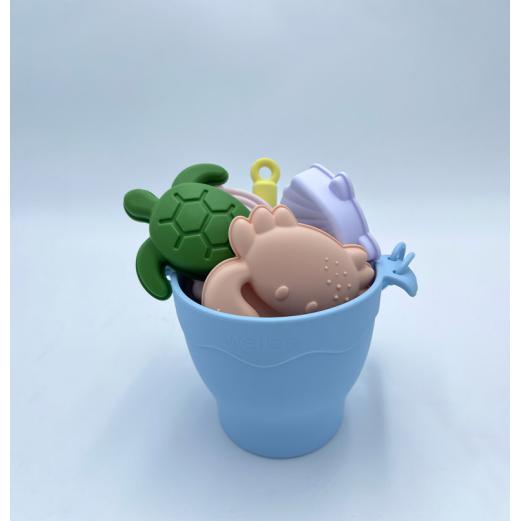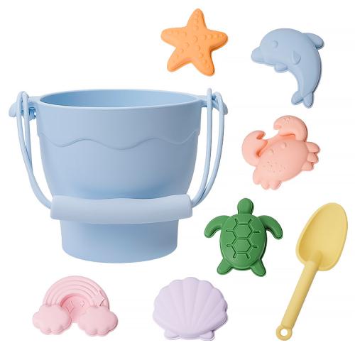Conjunto de brinquedos de praia em silicone para fazer construções originais à beira-mar ou na areia do parque infantil. Cores suaves em tons pastel que atraem a atenção dos mais pequenos. O conjunto é composto por balde, pá, 6 formas de areia e saco de transporte em rede.